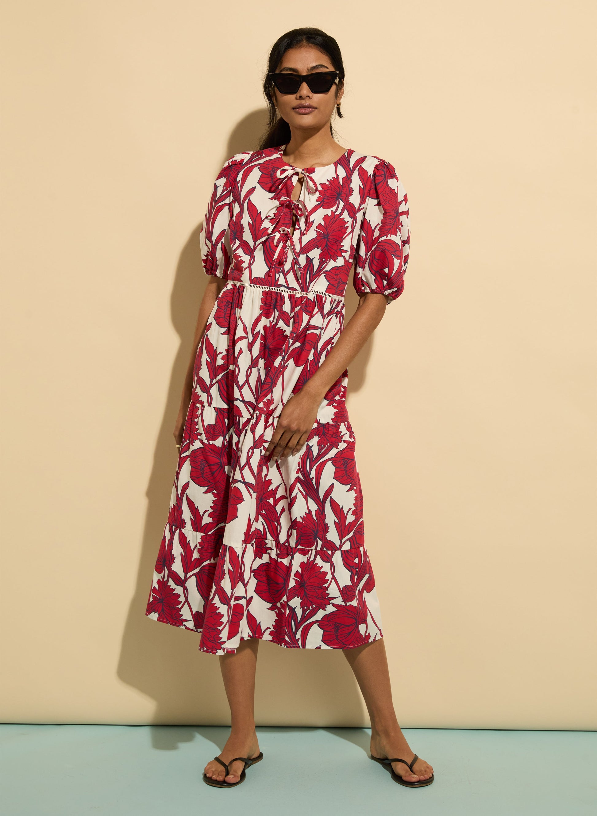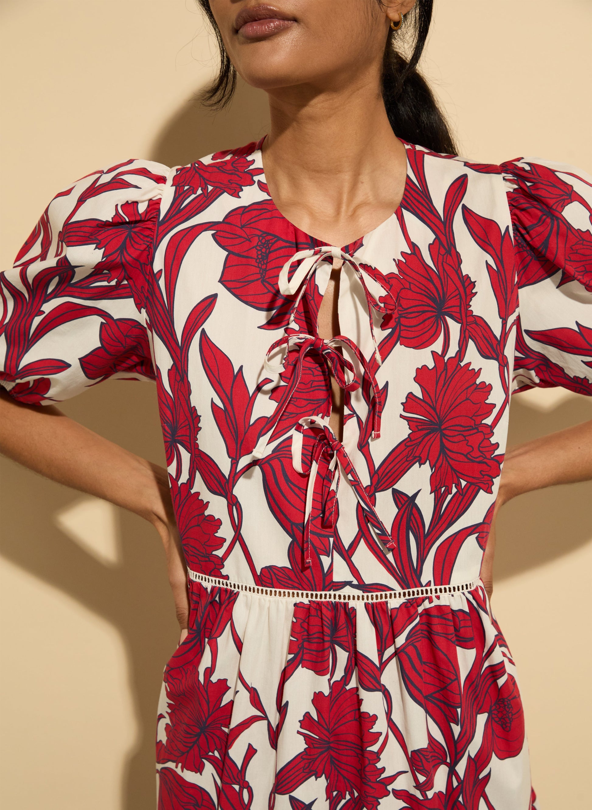 Impactful but so easy, we’ve got a soft spot for the Amelie Cotton Tie Dress. This style in crisp organic cotton features generously puffed sleeves and a front opening which fastens with a pair of ties. The midi skirt is tiered for movement, and then there’s the print: we love the uplifting dahlia pattern! It’s sure to put a spring in your step with mary-janes or trainers.