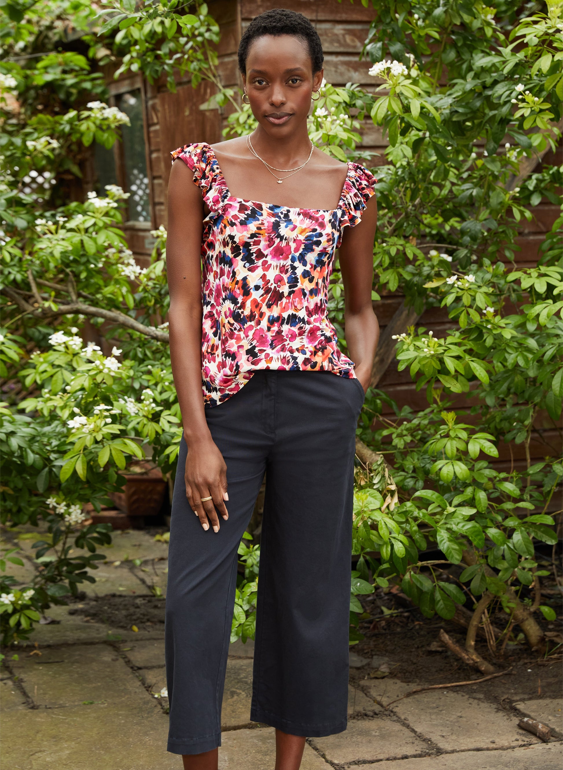 We love the square neckline and ruffled sleeves of the Anais Marie Top - but the devil is in the detail at the back too! This pretty style features two ties which you can tie into a bow, or knot and leave to hang down. Either way, we’ve cut it so you can still wear a bra with it. In comfortable jersey, it’s a flirty summer update for chinos and pale denim.