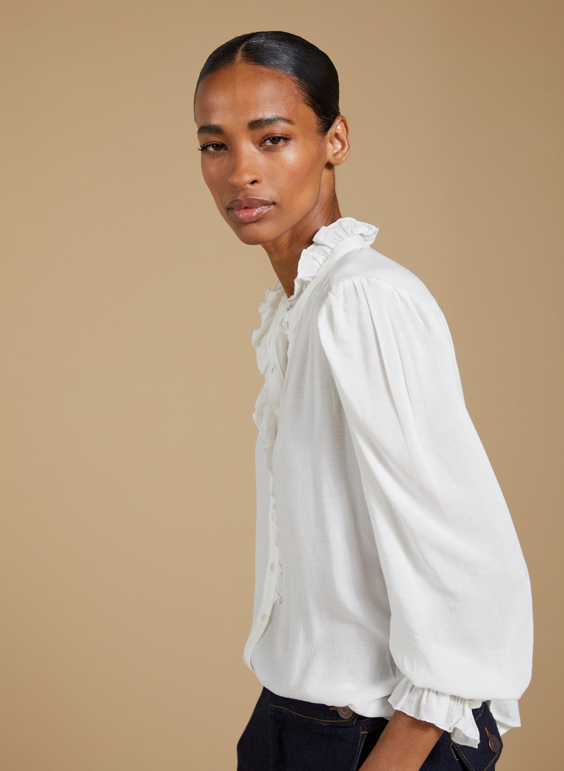 If a feminine blouse is your thing, then you won’t be able to resist Aurora! This style is all you need to elevate a pair of jeans, thanks to the soft ruffle trim adorning the collar and placket. The fabric is special too: in a semi-sheer textured spot jacquard, proudly makes use of surplus fabric.