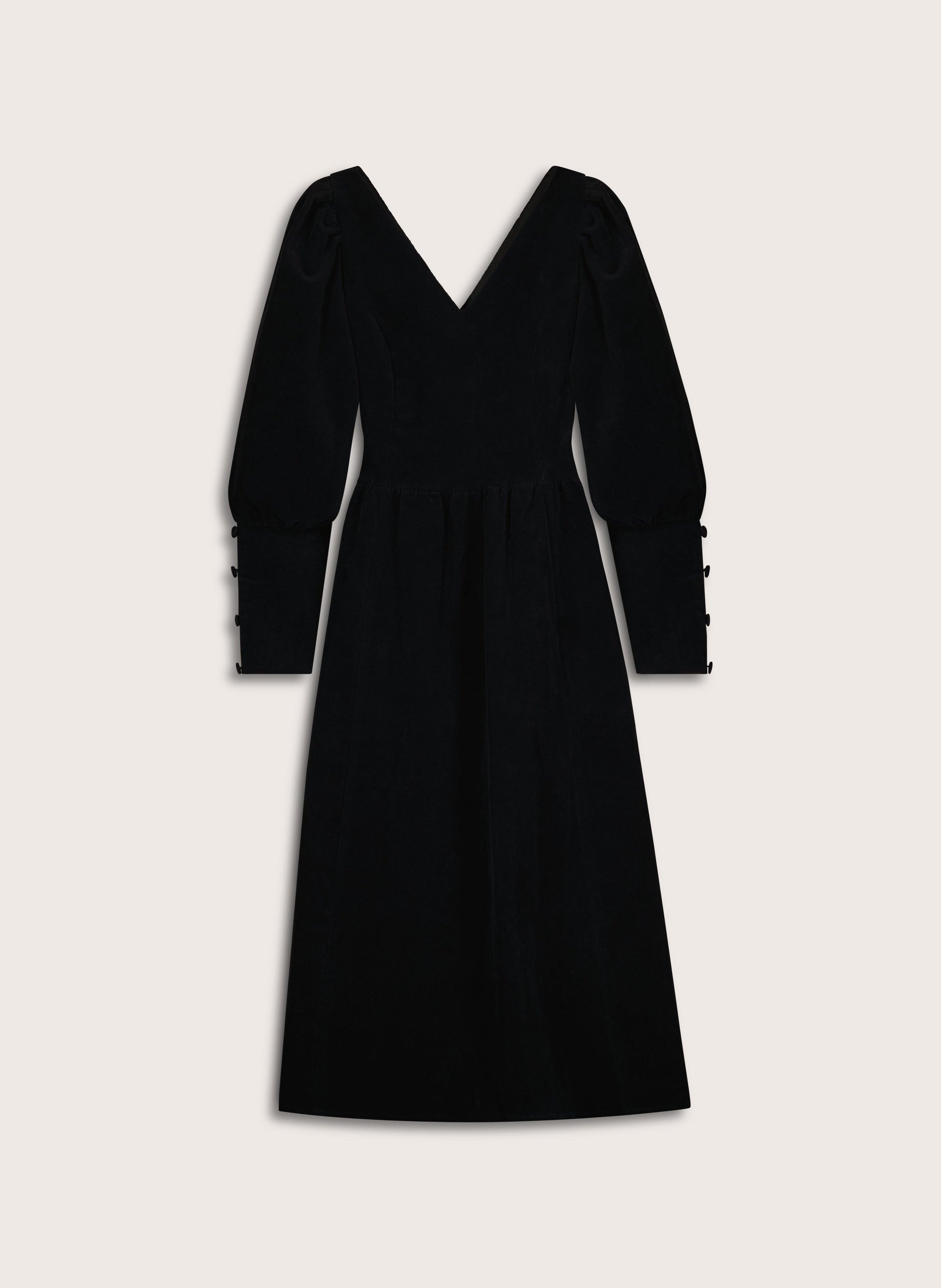 Unapologetically 80s-inspired, the Benedita Midi Dress is the kind of statement piece that you’ll always have a memorable night in! It’s cut with a deep v to the back and front with puffed sleeves that taper into slim, deep cuffs which fasten with rouleau loop buttons. Neat around the waist, the full skirt is perfect for swishing around in. The rich fabric looks like velvet but is in fact a fine, organic cotton corduroy with just the right amount of stretch. See you on the dancefloor in this one!