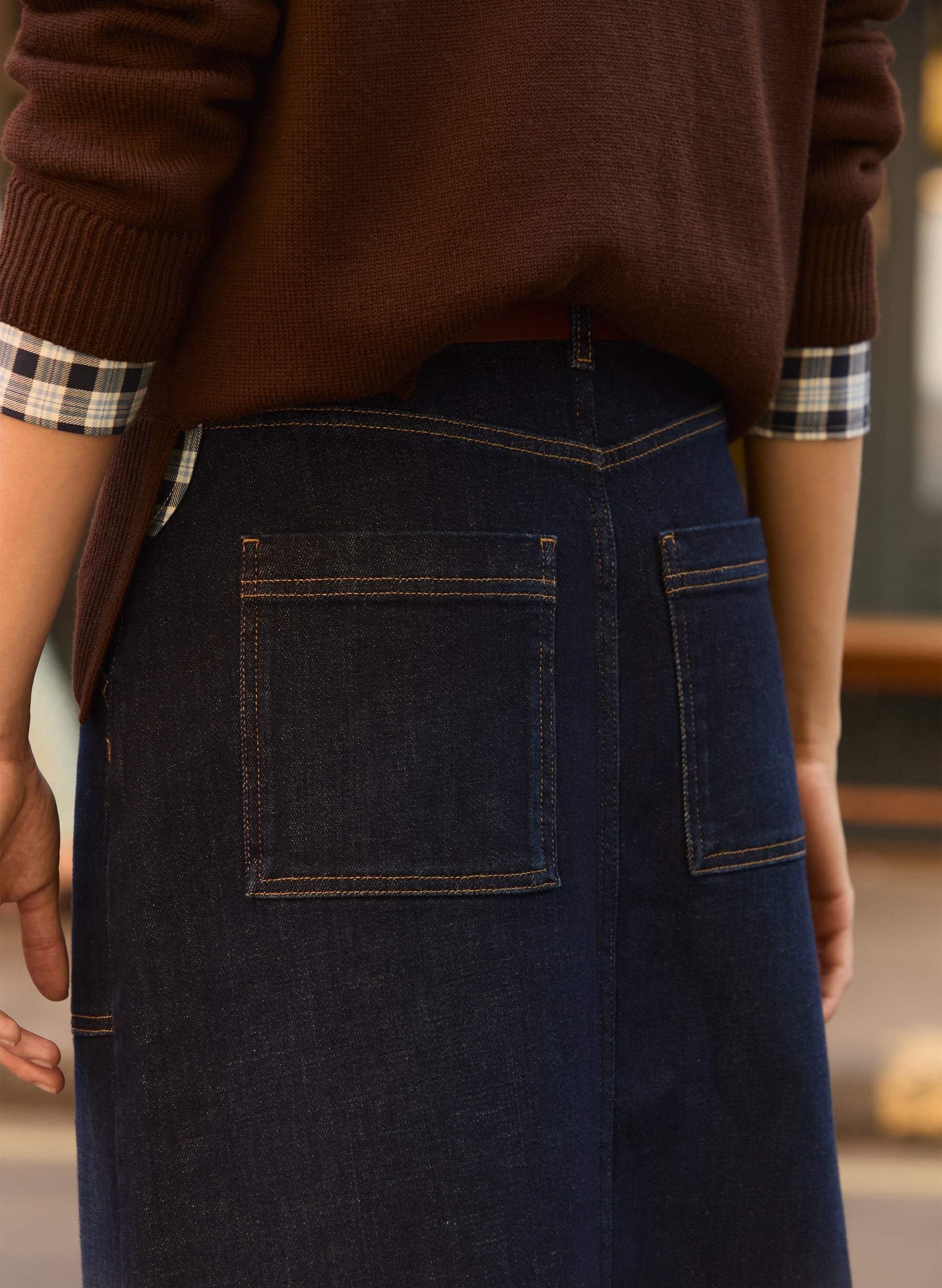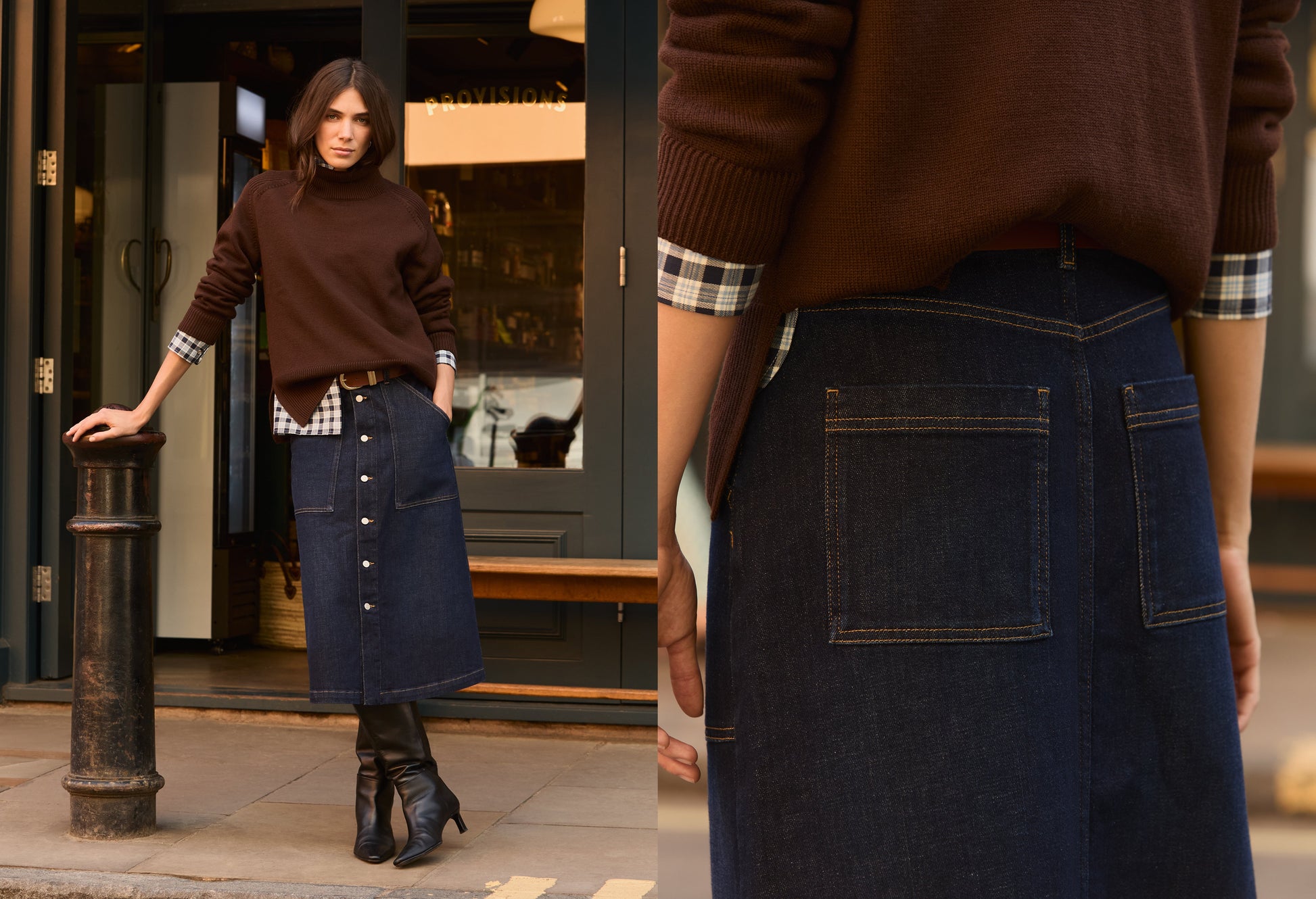 Denim skirts are a fun alternative to jeans and our Bobbie Midi Skirt comes in a chic, A-line shape with large pocket seams for a modern update. Crafted in organic stretch cotton, this style buttons through and is cut to sit on the waist and skim the hips. Its dark indigo wash goes with everything: we’ll be wearing it with knee-high boots and pretty blouses.