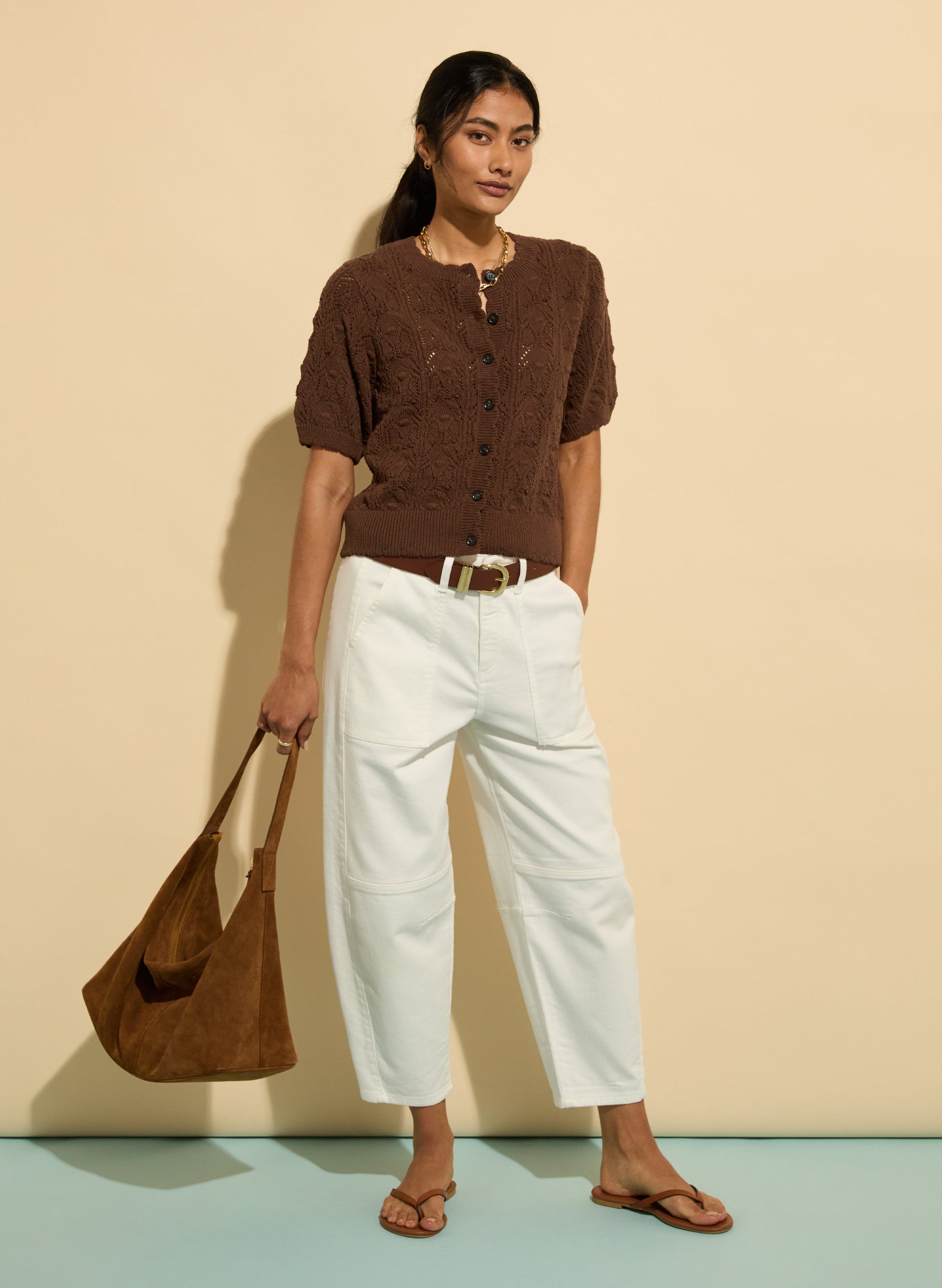 A crochet cardigan makes layering easy in warmer weather. Our Celestia Crochet Cardigan is crafted in Ecotec®, a blended recycled yarn spun in Italy, and is cut for a neat, waist-skimming fit. So pretty, it features scalloped edges on the hem, neckline, and cuffs. Throw it over a vest top with shorts, or pair it with a printed midi dress.