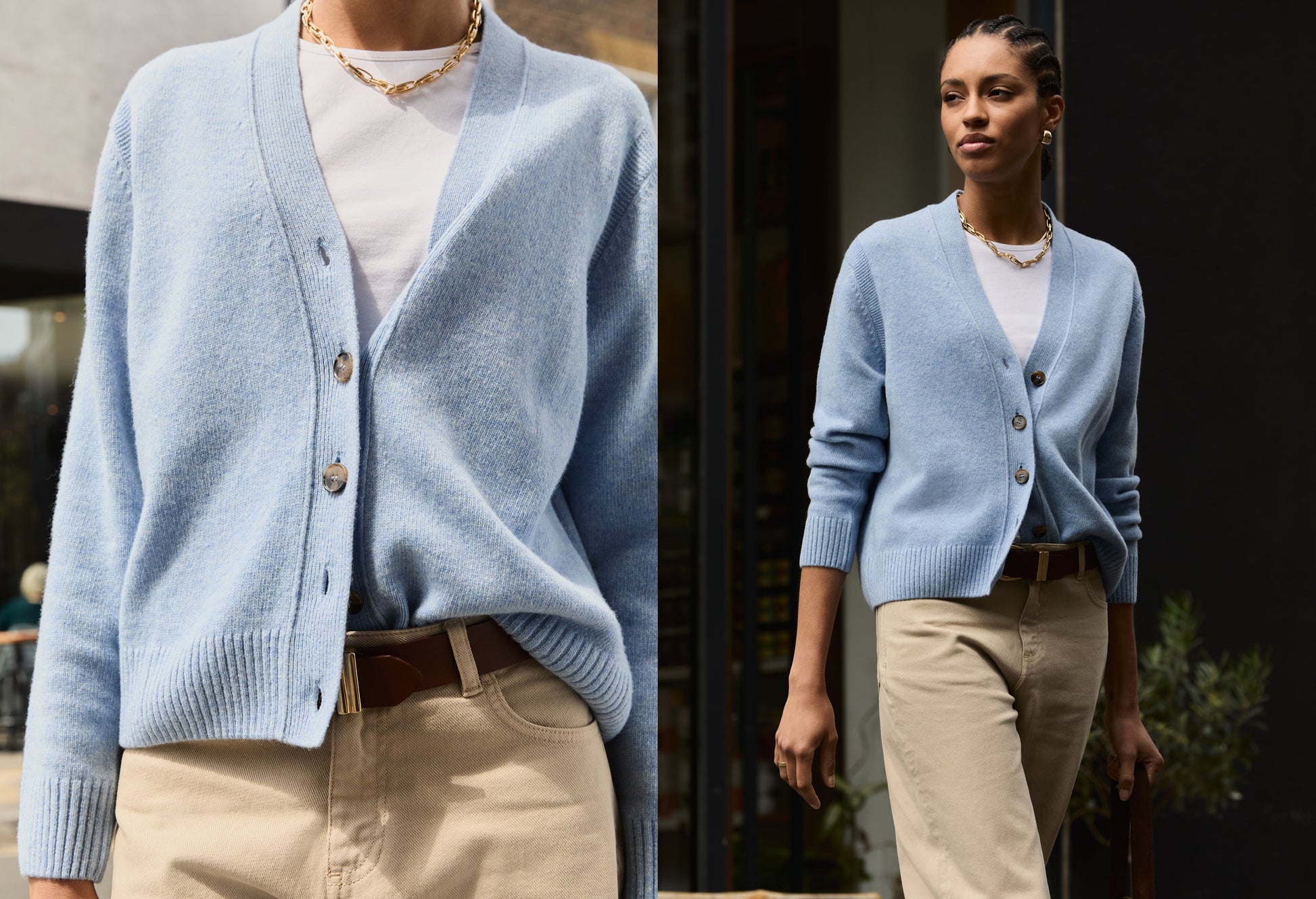 The Celine cardigan in light blue is proof that layering can be cool! In a midweight recycled wool blend, it is cut for a boxy fit with a v-neck and a stitch detail on each shoulder. Timeless and simple, it offers year-round versatility: layer it over rollnecks and half-tucked into jeans for warmth, then swap out for a camisole or plain tees on hotter days.