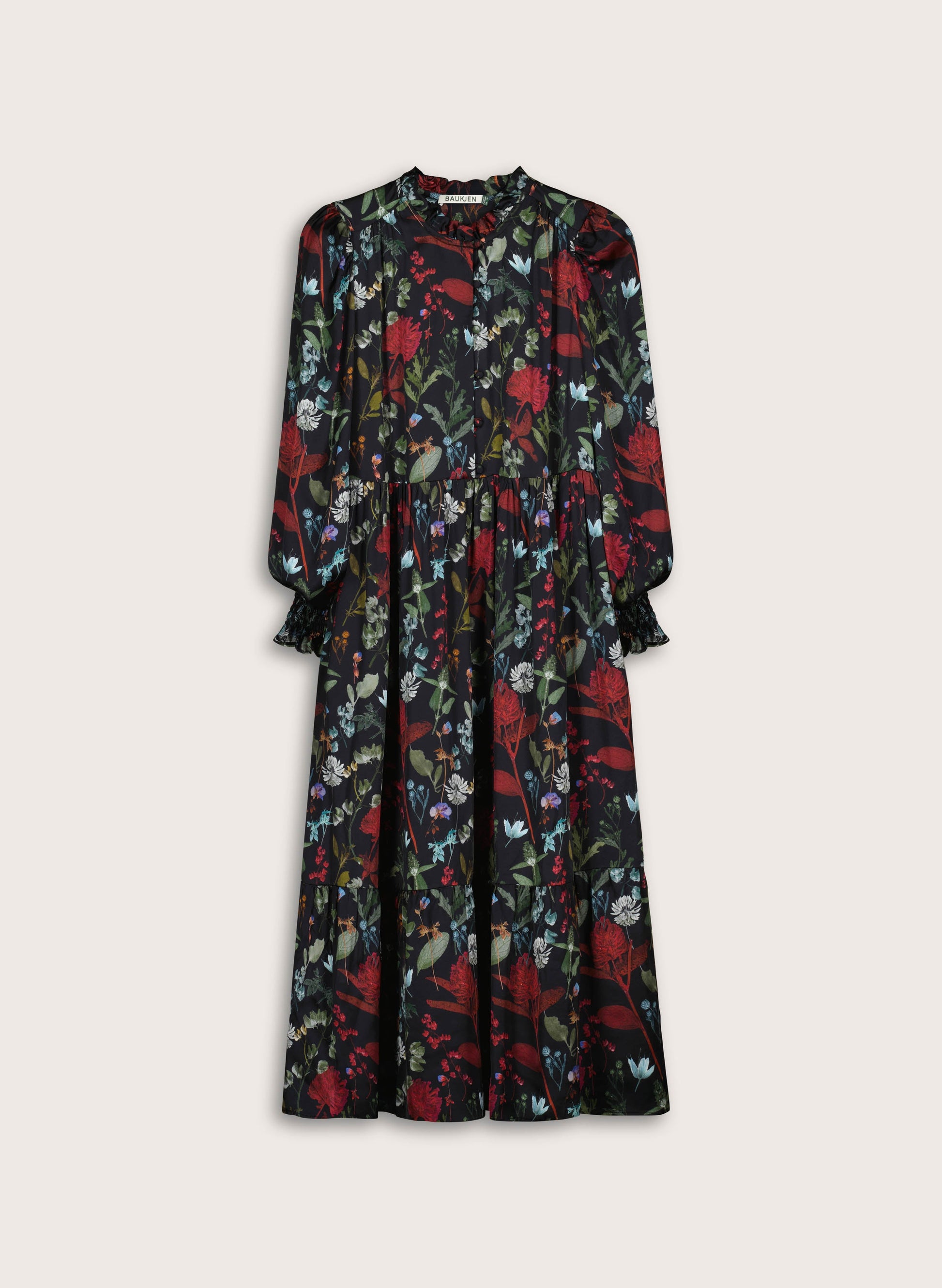 Dressy but oh-so-easy, the Grace Printed Midi Dress packs a punch! Its colourful botanical print on a black base makes it easy to style with tailored jackets and shoes ranging from boots to platform sandals. This pretty style in swishy viscose comes in a relaxed shape and buttons down to the waist with rouleau loop fastenings. Its tiered skirt, frill collar and smocked cuffs make it feel elevated - but never at the expense of comfort.