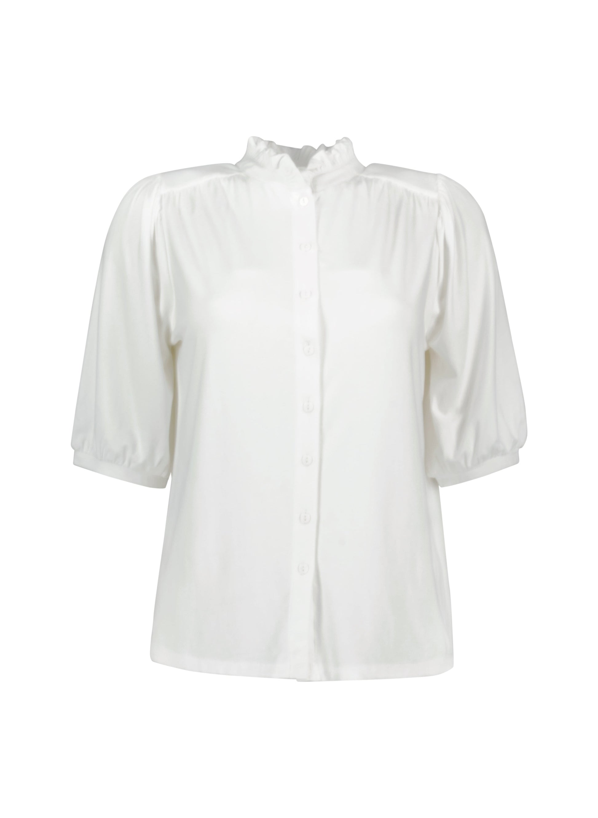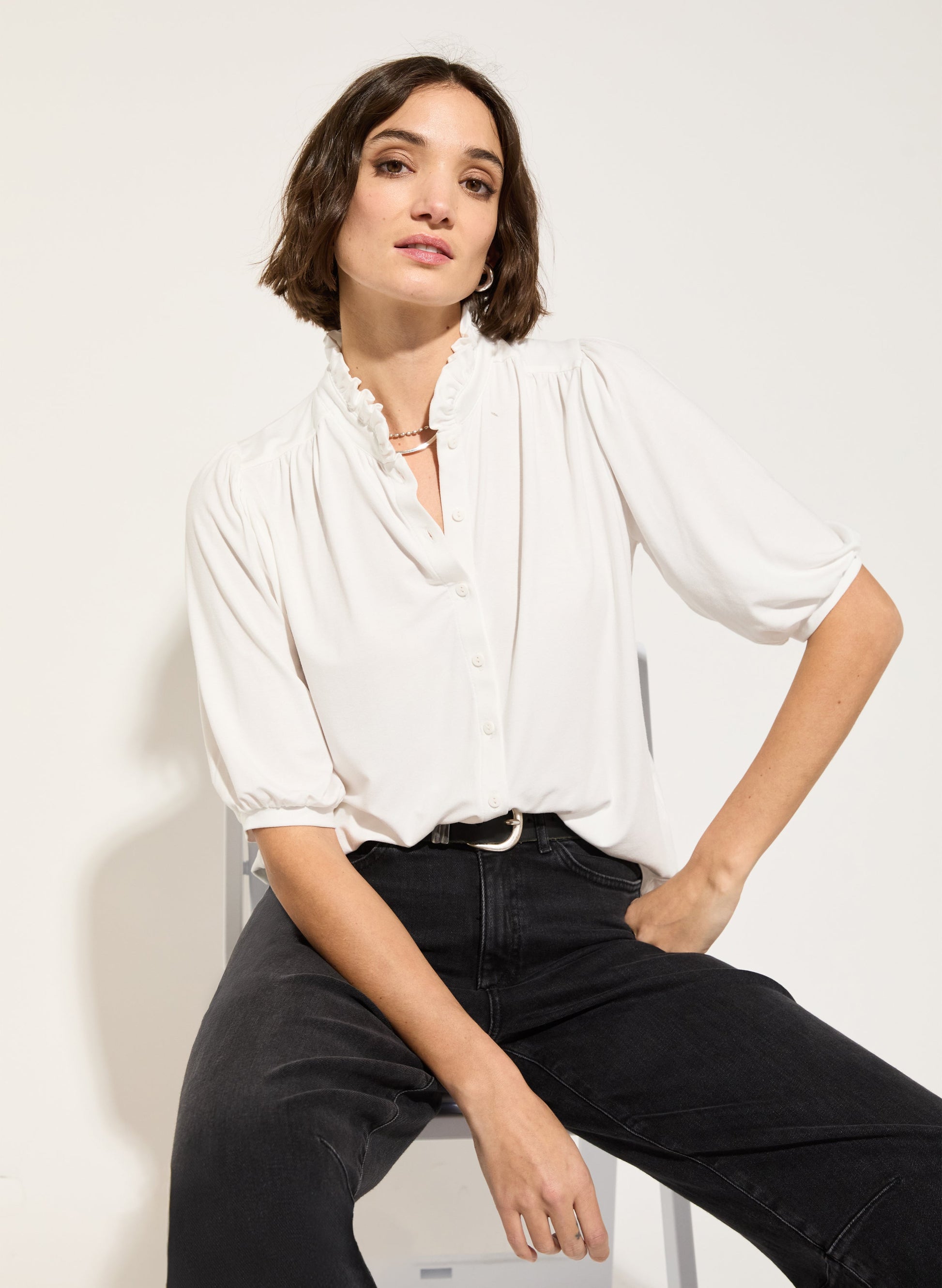 Coupling comfort with all the feminine details we love, the Janey Blouse will effortlessly elevate both work and weekend outfits. This easy style in stretchy, responsibly-sourced jersey features a ruffle stand collar and gathering into the shoulders and cuffs for a soft silhouette. Wear it tucked into tailored trousers for the office, or with a denim skirt for weekend brunch and prepare to feel great!