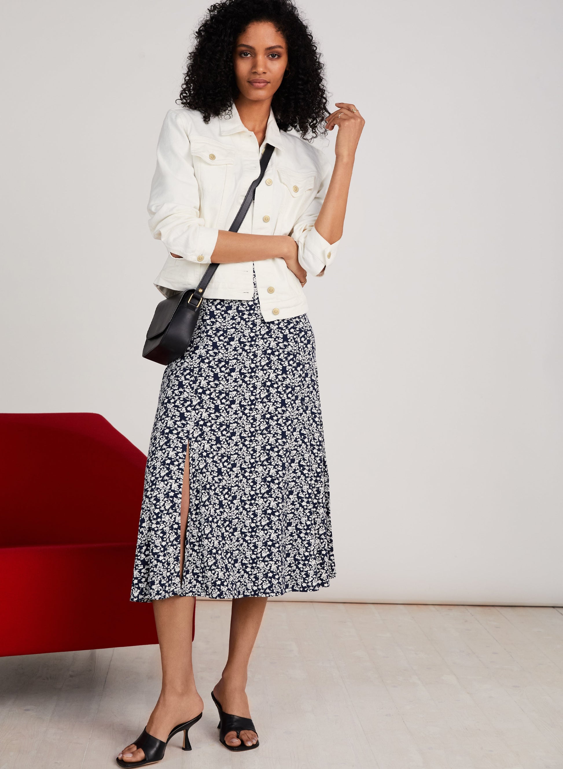 There’s something irresistible about a sweetheart neckline - and Jaylene has a pretty tie-back detail too. This feminine style is shaped around the bust, waist and hips, then gently flares out with a small split for a feelgood fit. Its white foliage print on a navy base and cropped sleeves make it an easy style to wear whatever the weather. Dress it up with mules and drop earrings, or down with a utility jacket and sneakers.