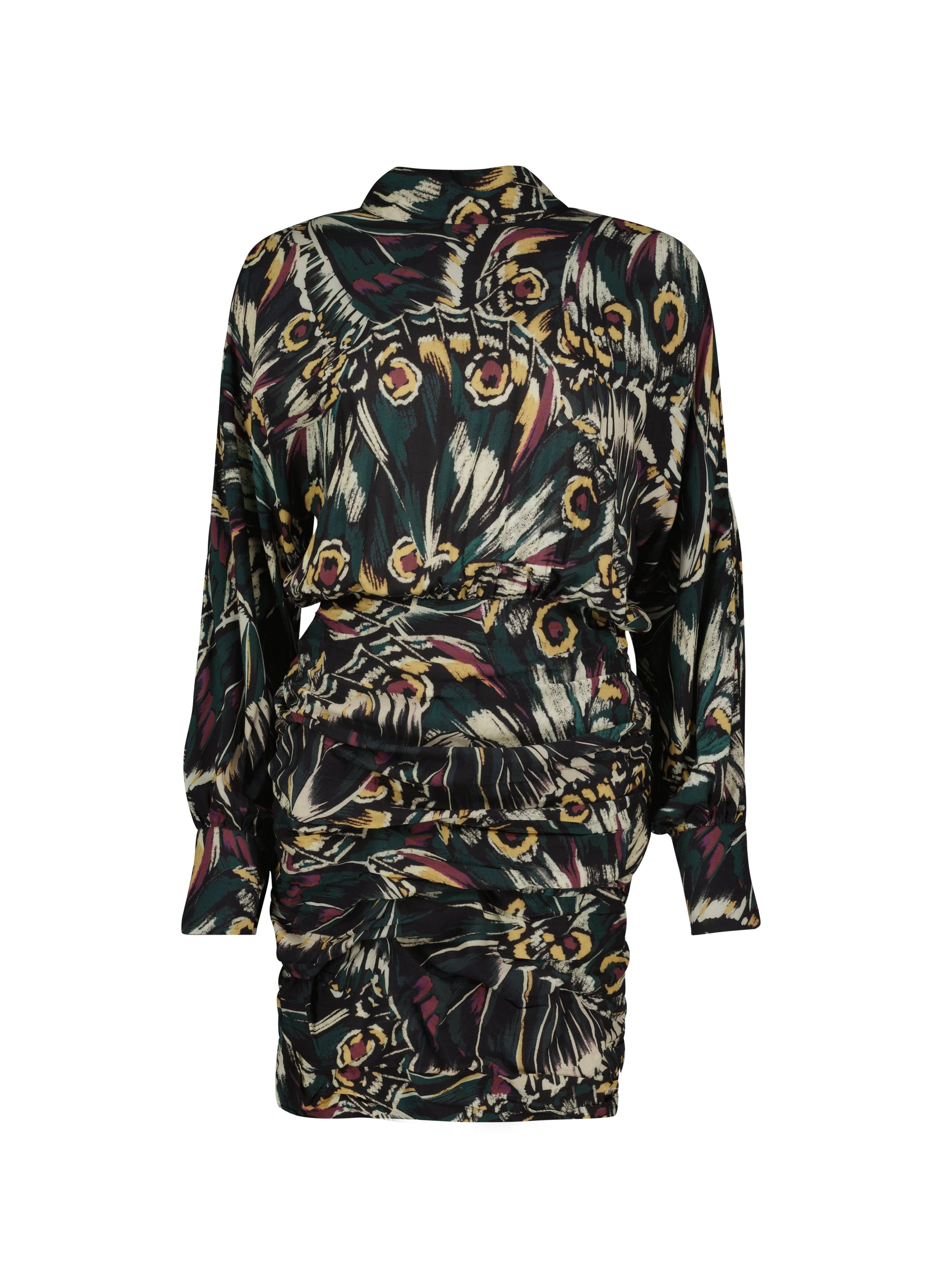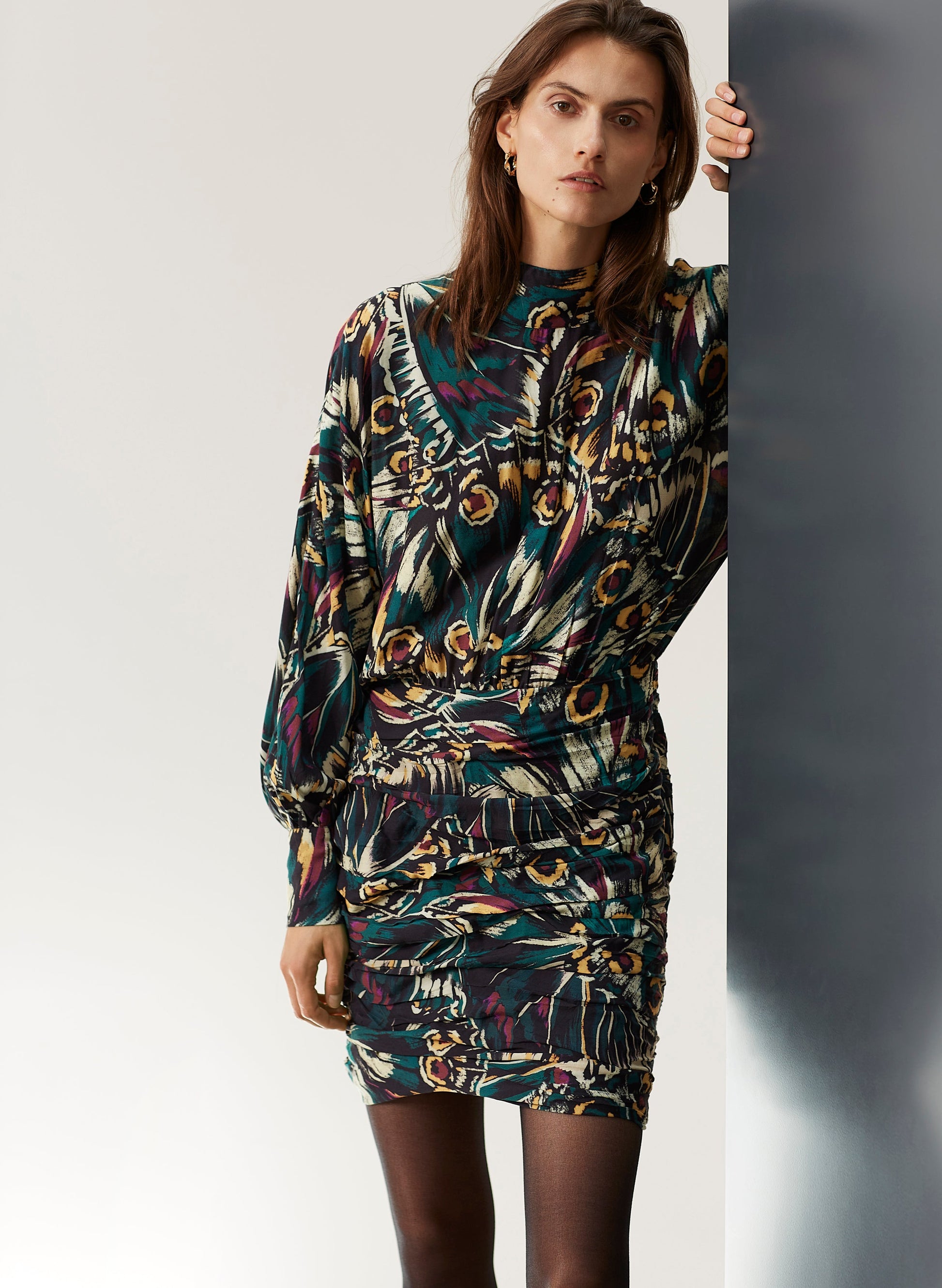 With its opulent jewel tones and fashion-forward shape, the Jocelyn is a fresh twist on the LBD. One for going out-out, its relaxed body and batwing sleeves are offset with a ruched skirt for a skimming fit around the hips and waist. Crafted in forest-friendly crepe and adorned with an abstract butterfly print, style it with sheer tights and heels to make your entrance.