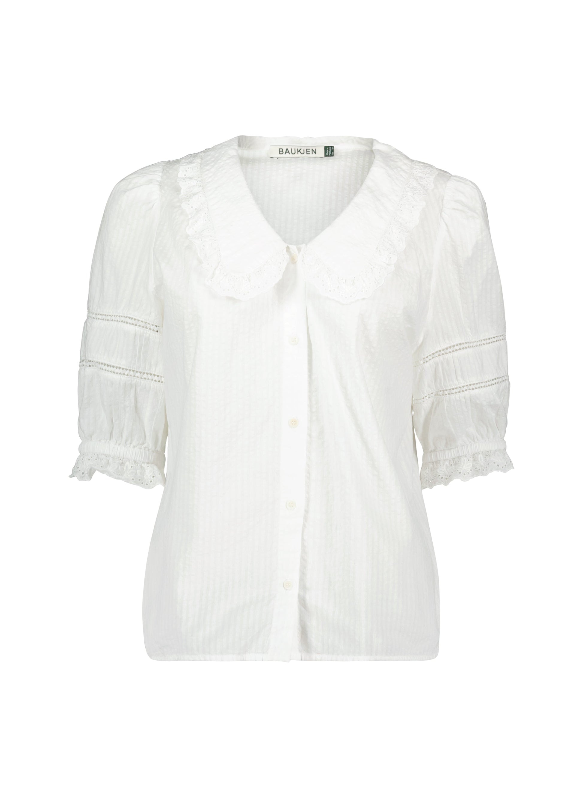 A pretty, white cotton top just spells summer! Our Marti Blouse features a Peter Pan collar and elasticated cuffs tipped with Broderie Anglaise. Crafted in organic cotton, this fabric features a subtle texture and broderie inserts on the sleeves. So easy to style with jeans and a pair of earrings, it’ll instantly elevate your whole outfit.