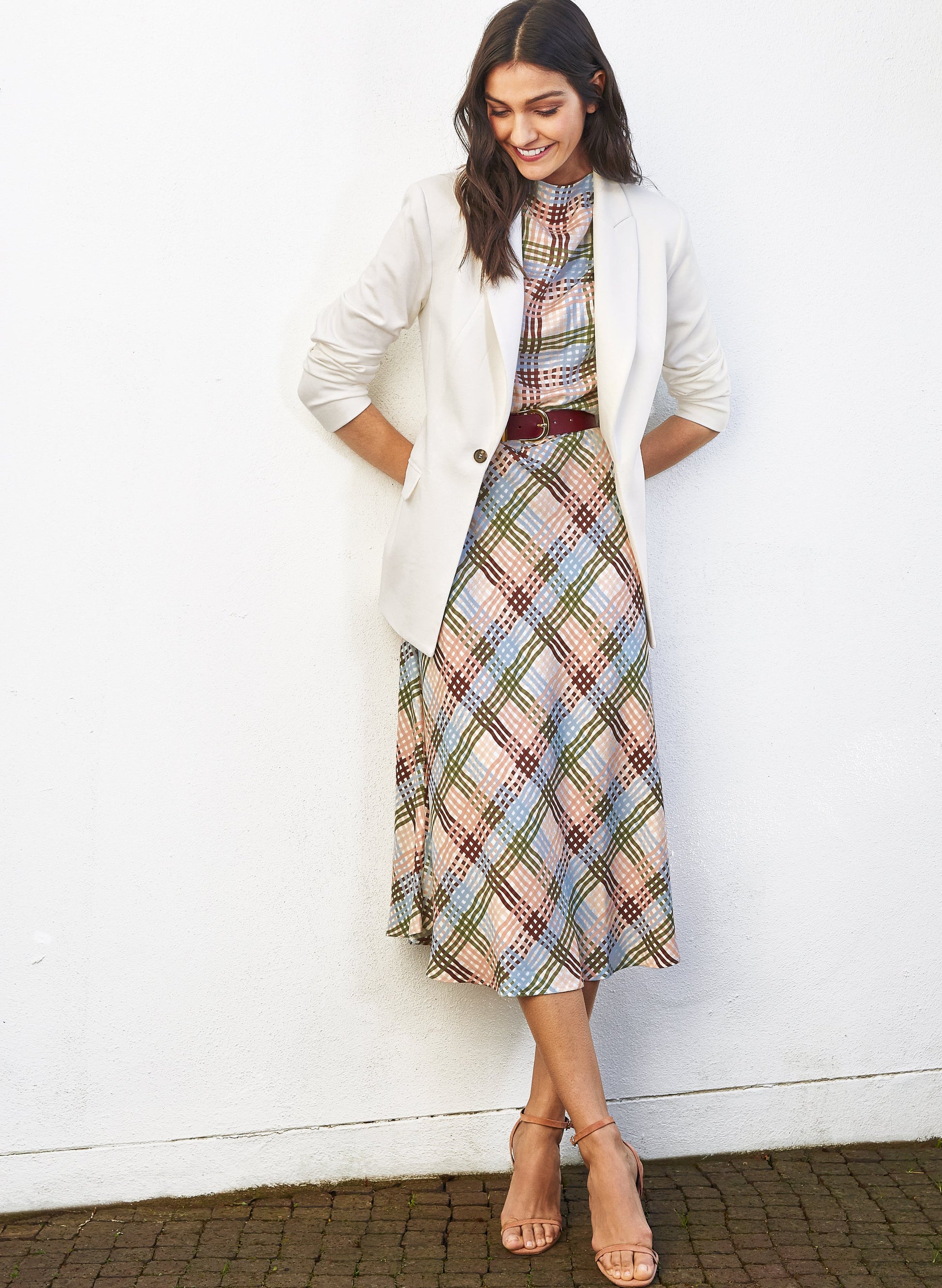We're seeking warmer weather and the chance to welcome this light and summer-worthy dress into our wardrobes. In a peach toned check print and flowing soft twill fabric, it is the ultimate spring summer day dress. Its elegant cowl neck and waist defining shape can effortlessly be dressed up for weddings or other formal occasions too.