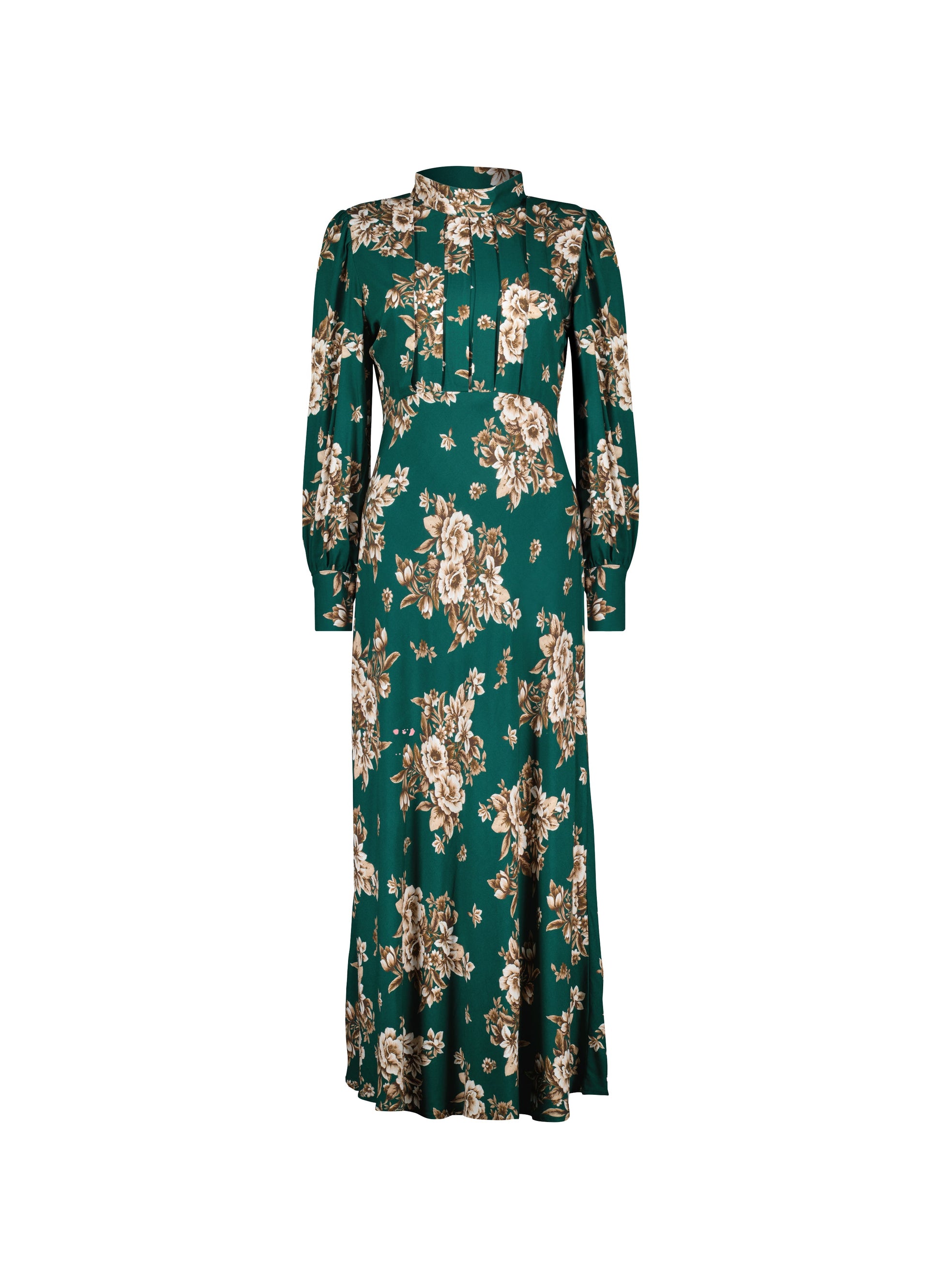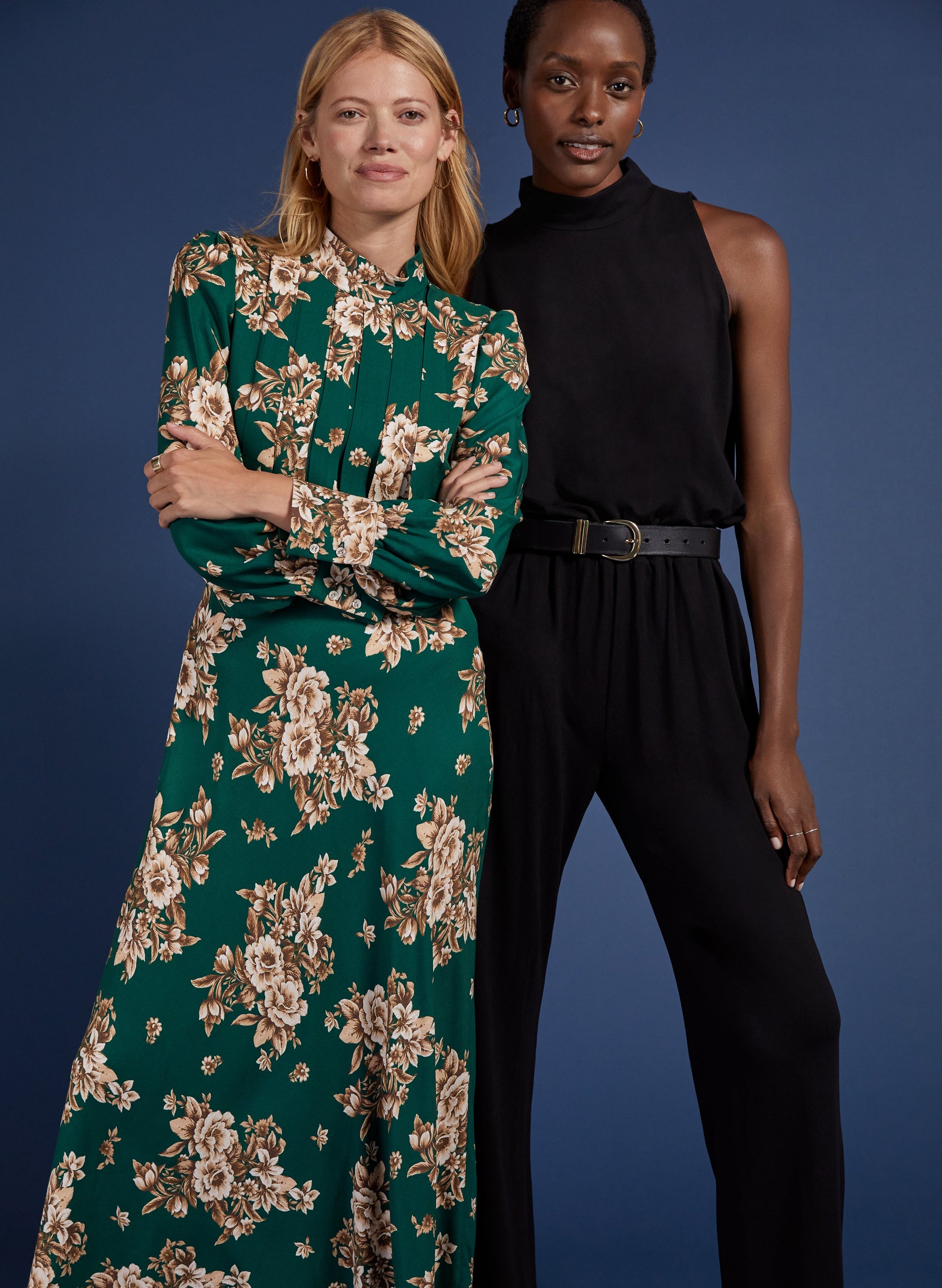 Dress to impress with Primrose. Crafted in LENZING™ ECOVERO™ twill, we love the impactful contrast between this style’s bold cedar-green base and its faded floral print. Inherently sophisticated, the pleated front features a split down to the high waist seam whilst the long midi skirt skims the body before flaring out from the knees. 70s-style blouson sleeves top it off. Style it with a black blazer and sandals for a special occasion, or with brown boots for work-to-dinner elegance.