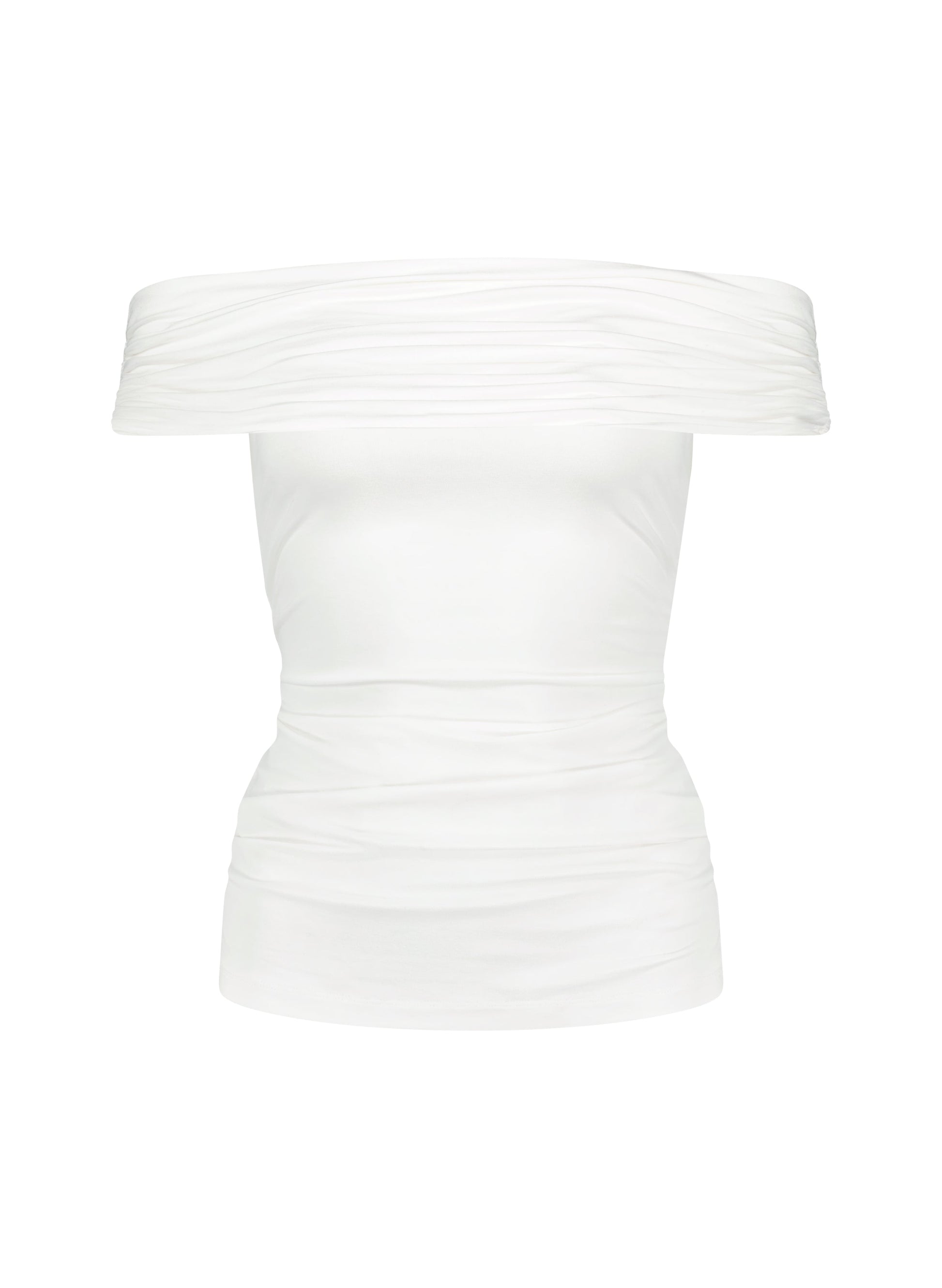 Perfect for showing off sun kissed shoulders, Winifred is a little white top that is pure wardrobe magic! Made from soft, stretchy jersey and ruched through the body, its off-the-shoulder neckline accentuates the shoulders. Wear it with a pair of wide-leg trousers and a chunky bracelet for an instantly glamorous look.